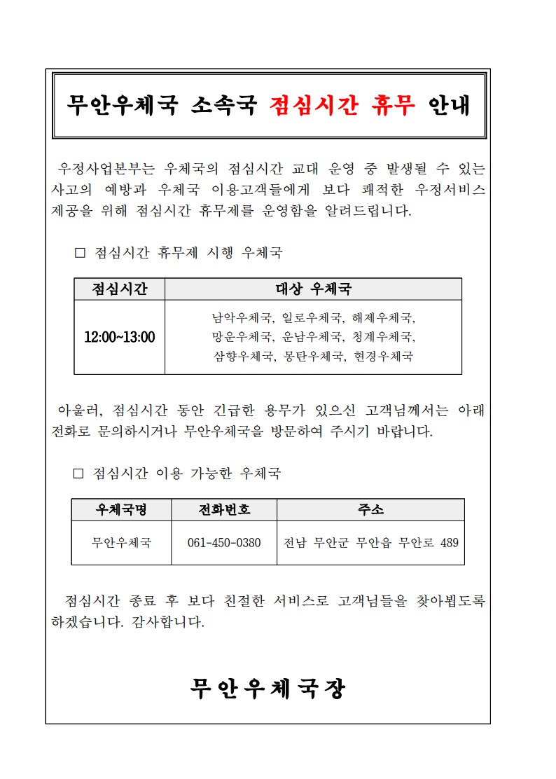 목포우체국(소속 관내국 포함) 영상정보처리기기(CCTV) 설치 및 운영·관리방침을 붙임 파일로 게시합니다.